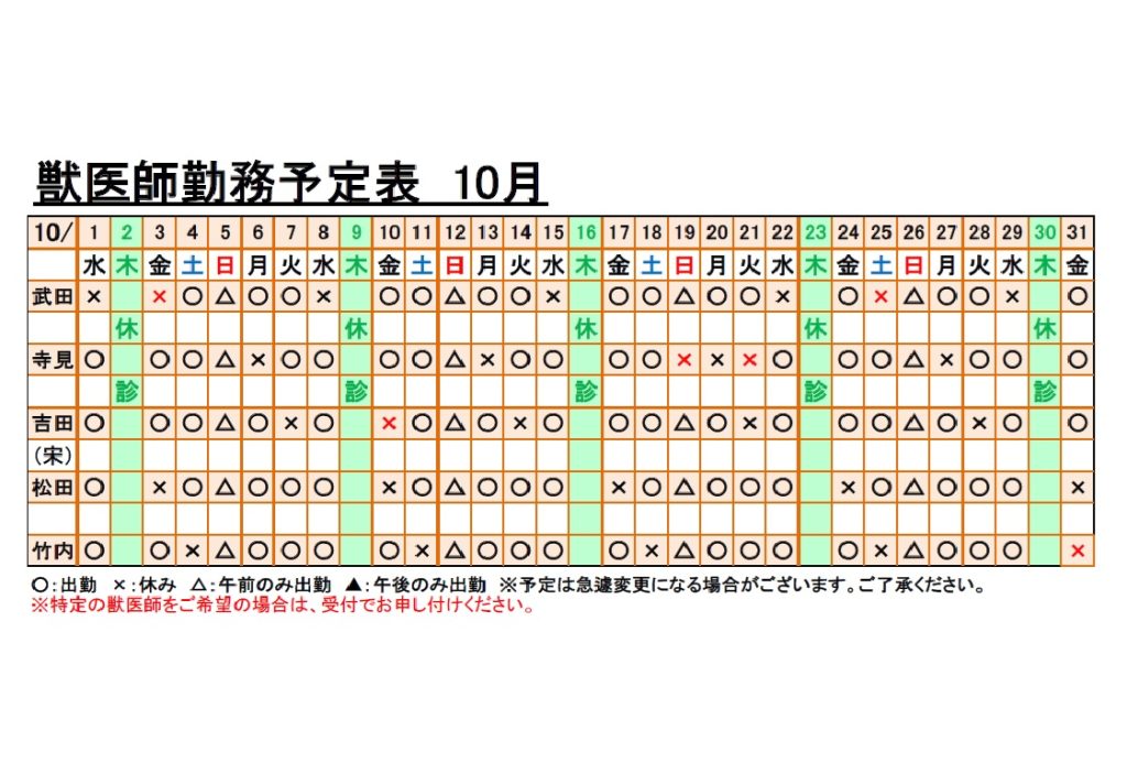 10月獣医師勤務予定表を更新いたします