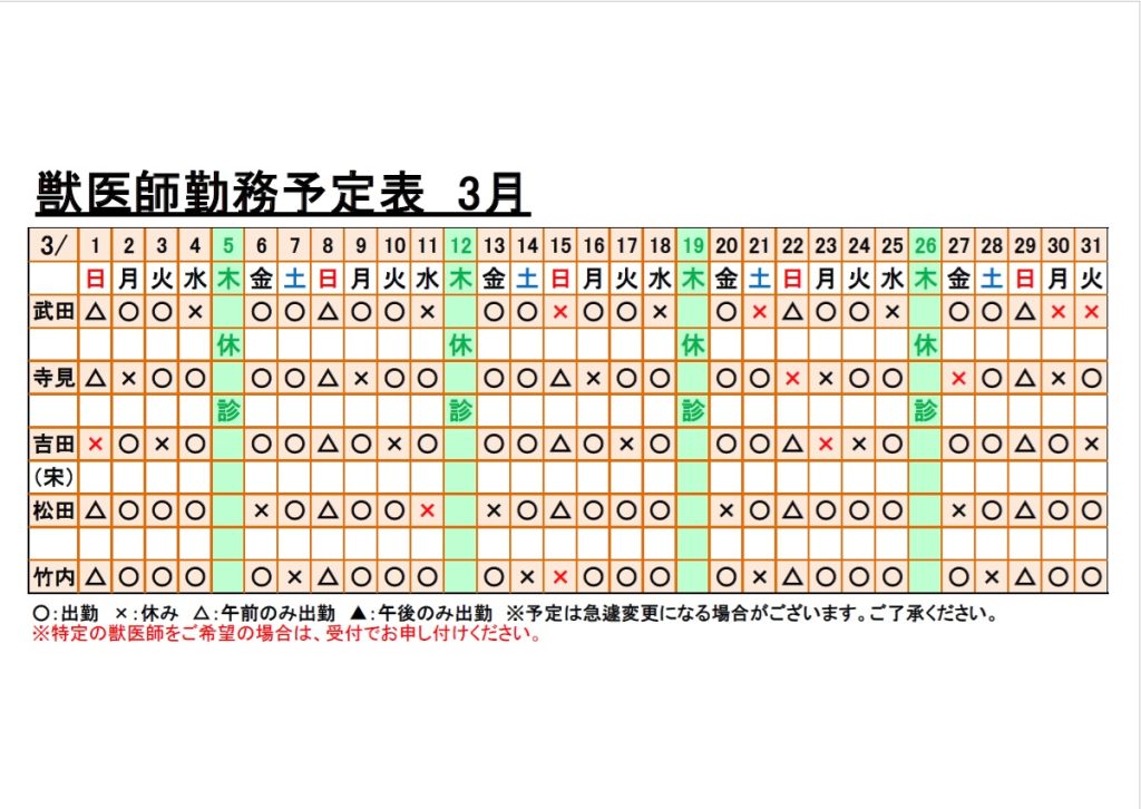 3月獣医師勤務予定表を更新いたします